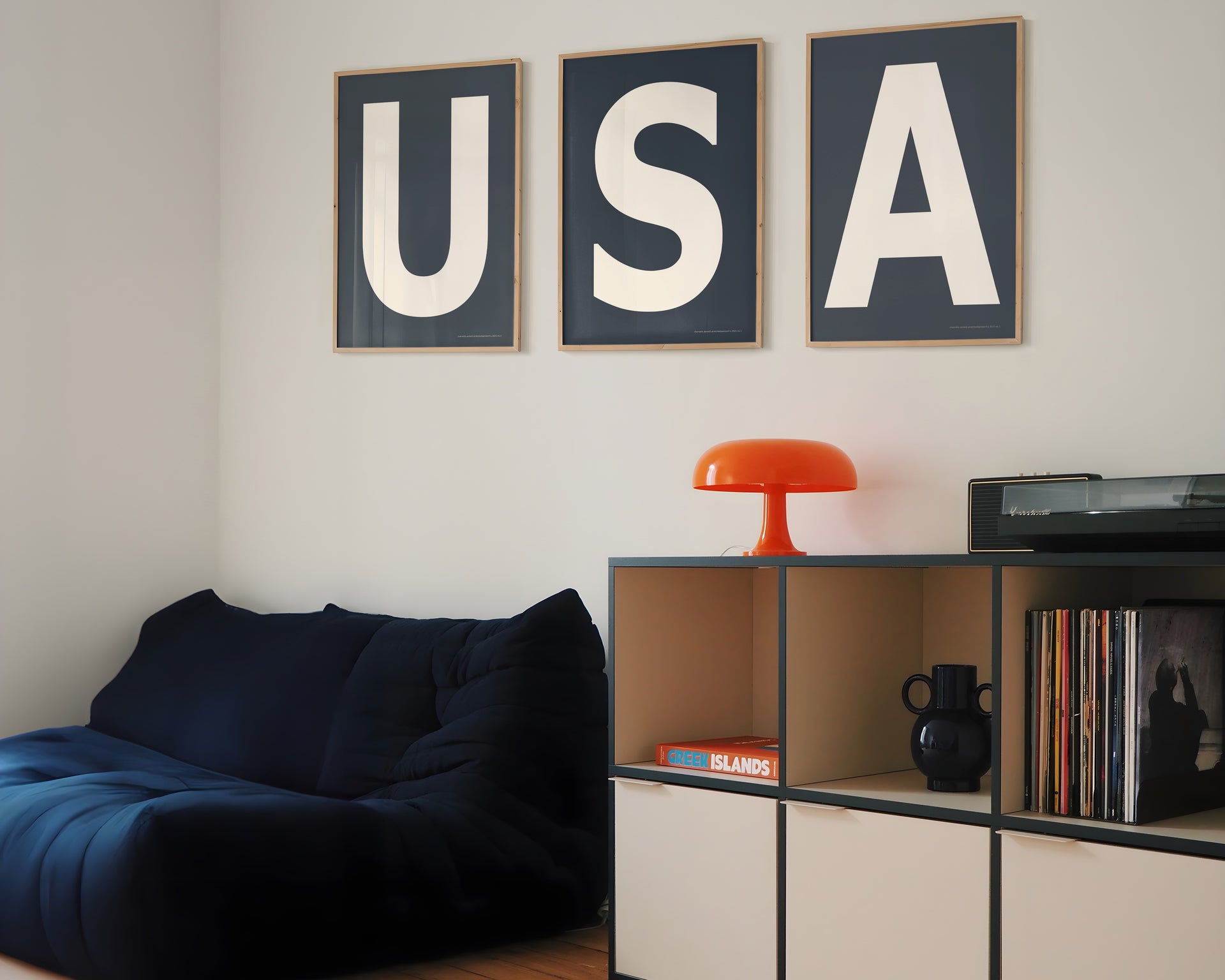 Our Series 5 letter prints feature white typography art on a navy blue background.